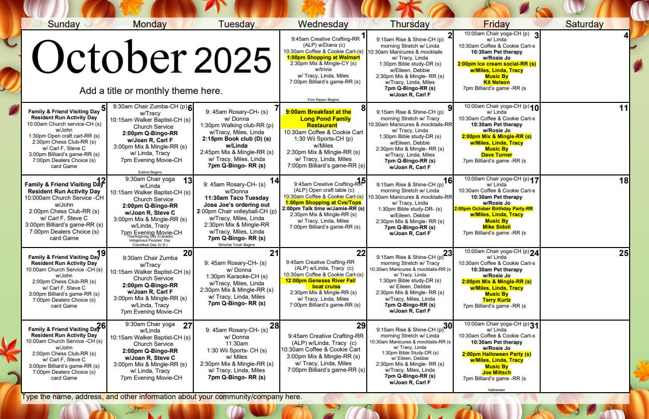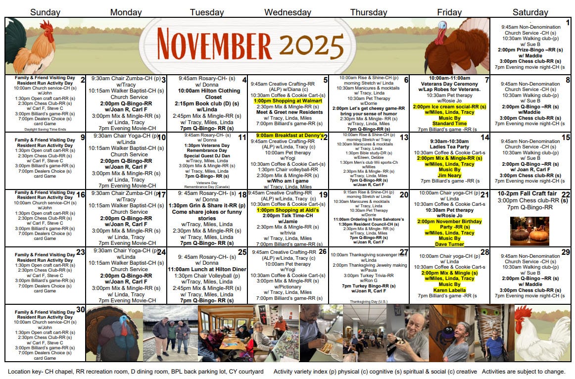 UPCOMING EVENTSThere's A Lot Going on at Hilton East! From classic movies in the rec room to music and arts & Crafts, we are constantly adding new activities to keep everyone entertained.October Activity Calendar November NewsletterActivity Calendar - NovemberActivity Calendar - OctoberSchool Groups Regular field trips from local schools mean there are always young students stopping by to share and to learn!