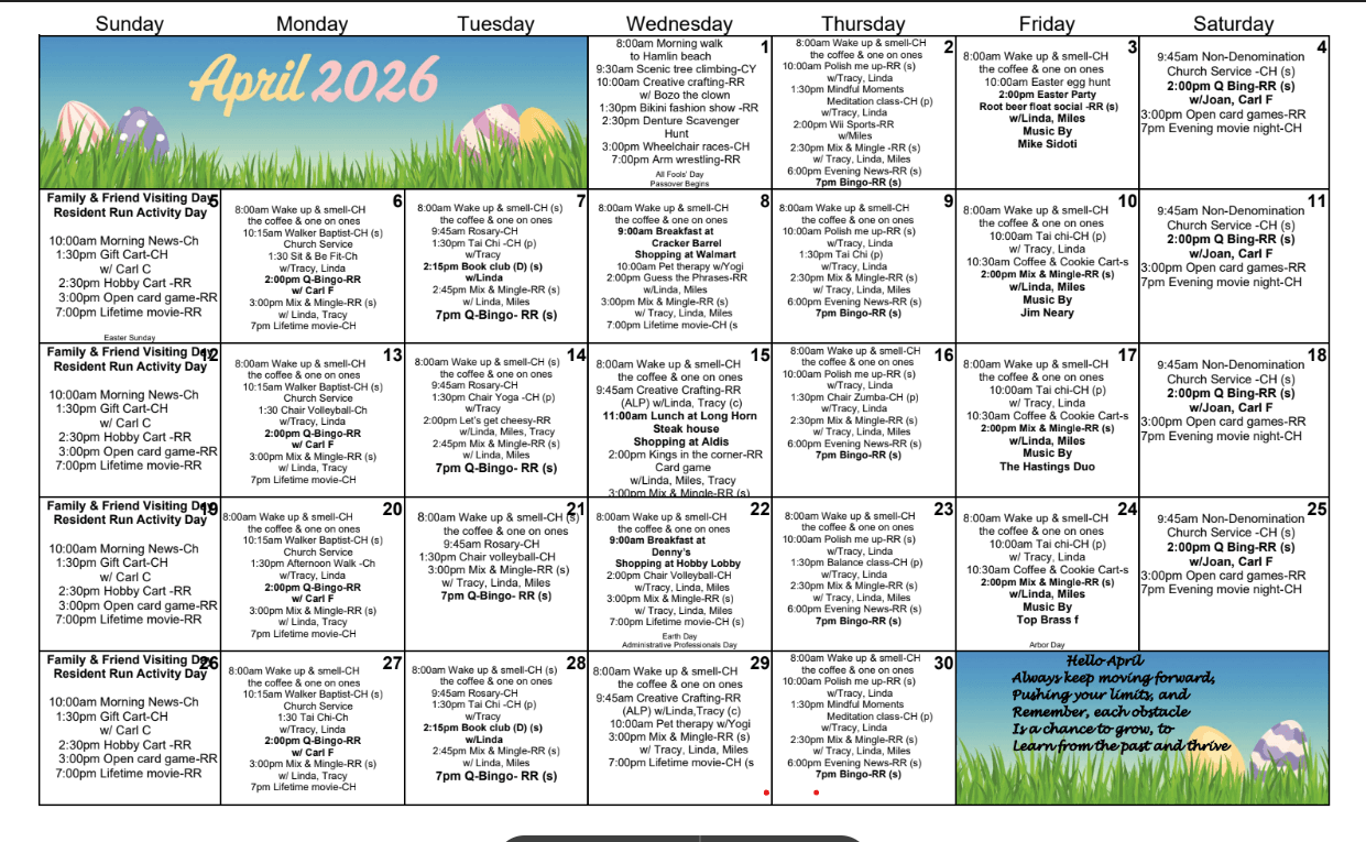 From classic movies in the rec room to music and arts & Crafts, we are constantly adding new activities to keep everyone entertained.